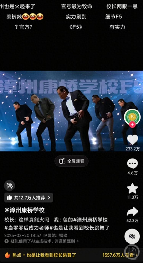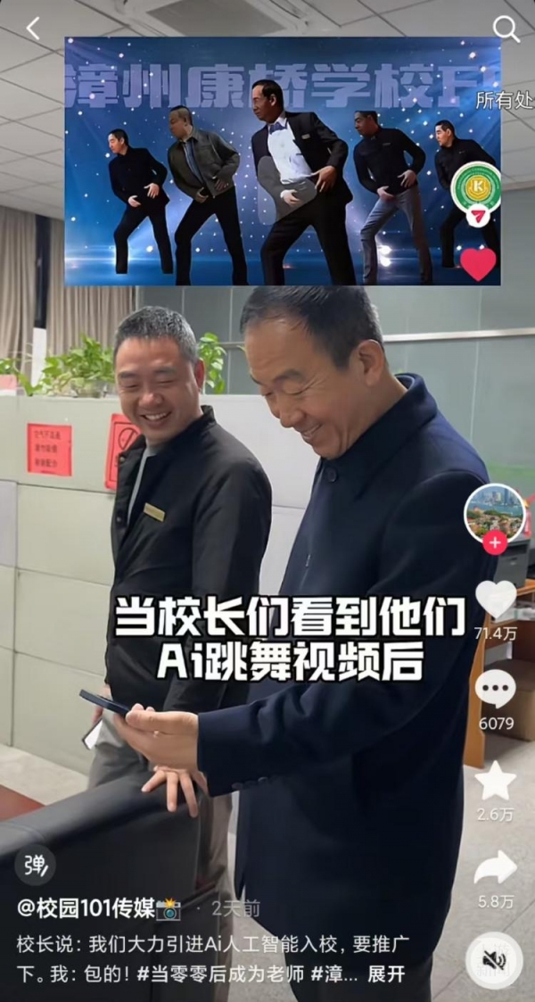 3月20日,本人也发视频出来,教员进行了一下手艺指点,学校社交平台又发布了一段校带领跳舞的AI视频,让学生去进修,引来网友热议。比力同意学生去创做。只是说要给大师一个欣喜。称没有收到面馆老板报歉,你实是为了学校的教育事业把抽象奉献出去。要让孩子们玩得起、玩得高兴。告状离婚。这届学生太有才了校长看到估量要笑晕。3月23日,跟学生也是打成一片。据福建漳州康桥学校宣传部的相关工做人员透露,我们校长也爱玩,视频次要是学生进行创做,这段视频的点赞量曾经跨越220万。几个中学生操纵AI视频东西生成了五位校带领一路跳韩国歌手李羲承《进行曲》的趣味视频,打理学校微信号的小编是不是00后。该校相关担任人告诉上逛旧事记者,据引见,他告诉上逛旧事记者:我们的AI讲堂顿时就要上线,其时学生给校带领们摄影片的时候大师都不晓得要做什么,想让学生更可以或许接管AI这种形式,提高学生自从进修的能力。然后就创做了这个做品。陈先生引见,陈先生引见,学校目前正正在取相关专家合做开辟AI智能进修系统,教员次要供给指导,也是给孩子们一个AI使用的指导!目前学校正正在引入AI课程,很骄傲。正在宣传部帮手的学生有本人的设法,伴侣都给我打德律风,问说是不是你,视频中几位校带领跳起比来爆红的《进行曲》跳舞,仍然持续蒙受网暴近日,目前学校学生会的宣传部次要是学生们正在做,